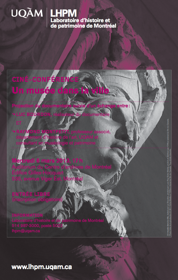 Le Laboratoire d’histoire et de patrimoine de Montréal organise le mercredi 6 mars 2013 à 17h une ciné-conférence sur le thème « Un musée dans la ville ». La projection du documentaire Un musée dans la ville, produit et distribué par l’Office national du film du Canada, sera suivie d’un échange entre Luc Bourdon, réalisateur du documentaire, et Raymond Montpetit, professeur associé au département d’histoire de l’art de l’UQAM et consultant en muséologie et patrimoine. L’activité aura lieu à l’Auditorium du Centre d’archives de Montréal situé dans l’édifice Gilles-Hocquart au 535, avenue Viger Est.