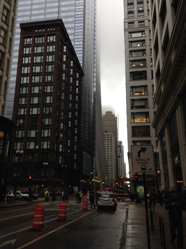 La journée devait commencer par l’ascension de Willis Tower pour une observation du haut des airs de Chicago et de sa région. La météo en a décidé autrement: un assez lourd brouillard a pesé sur la ville toute la journée. Nous avons modifié notre programme. Nous avons plutôt suivi la rivière Chicago pour observer de plus près quelques joyaux architecturaux de la ville.