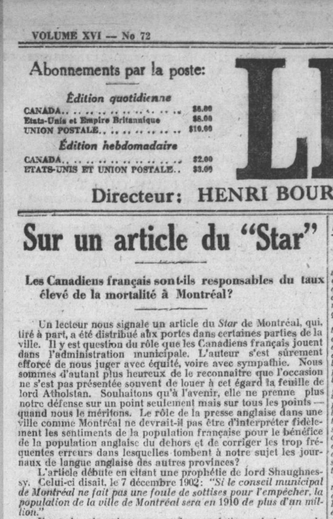 2. Des voix dans les débats de la Cité – De différentes façons, les journaux à grand tirage jouent un rôle comme acteurs dans les affaires politiques municipales. Mon objectif sera de déterminer comment – que ce soit comme voix distinctes ou comme plateformes pour la voix d’autres acteurs individuels et collectifs – les journaux à grand tirage participent à ces débats, qu’il s’agisse de la politique partisane et des campagnes électorales à l’échelle municipale, ou encore des débats socioéconomiques sur les grandes problématiques urbaines qui ont lieu durant la période étudiée.